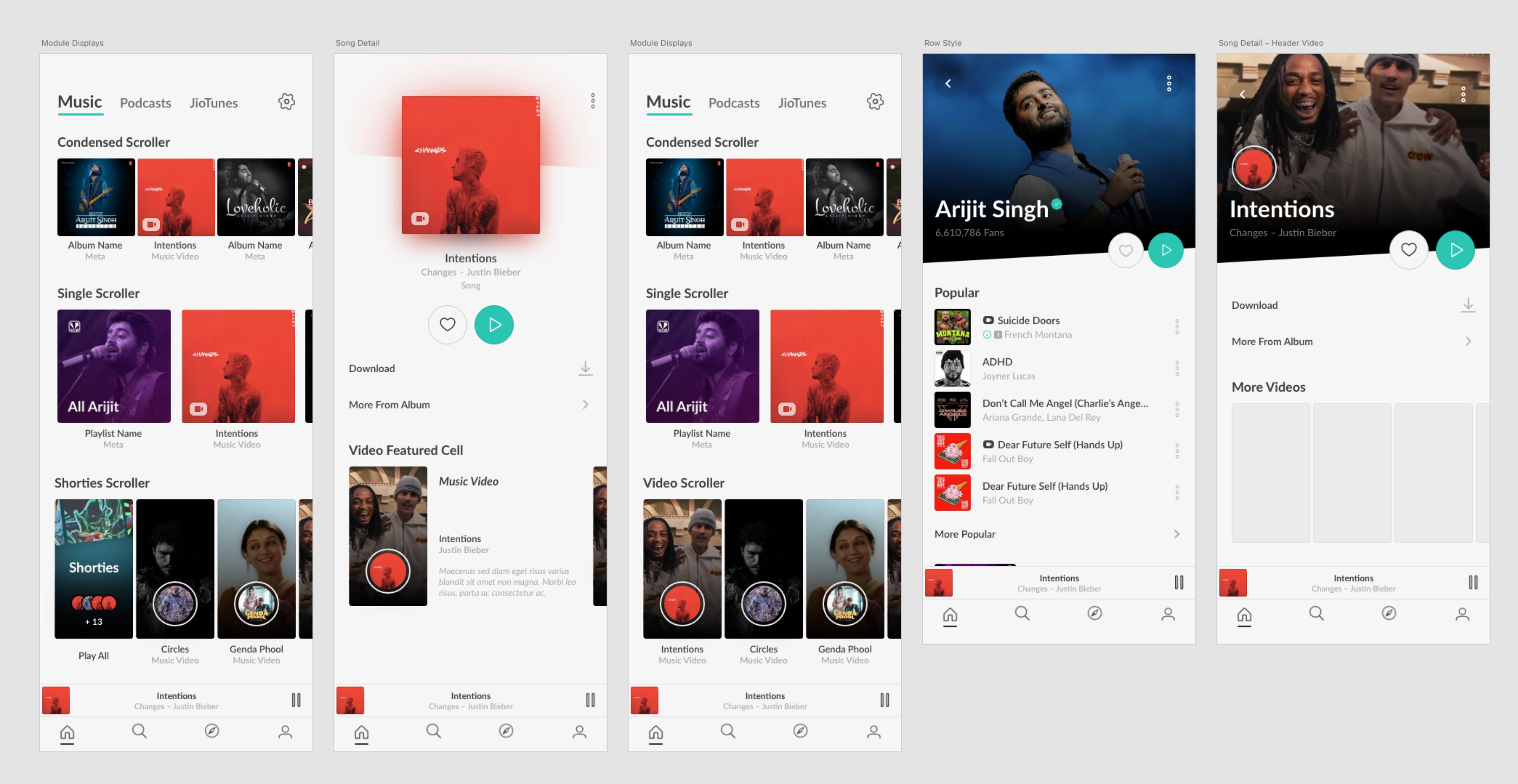 The first stage was redesigning the player (above) in a way that could seamlessly facilitate video. The JioSaavn player was already unique in that the “now playing” view and queue are rolled into one fluid page. We had to figure out how to add more (support for video, lyrics, and some kind of callout for various purposes), but make it feel like less.